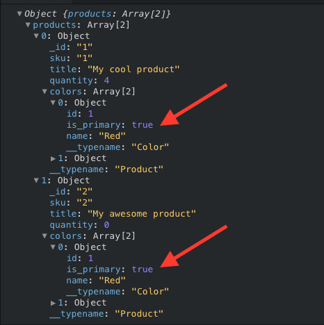 Apollo는 엔터티가 동일한 ID를 가진 쿼리에서 멱등성이 있다고 가정한다. 우리의 예시 상황에서 다른 product가 동일한 clolr에 대해 다른 is_primary를 가질 수 있기 때문에 이것은 사실이 아니다.